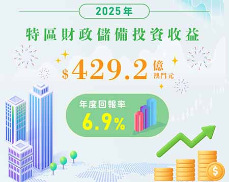 為妥善管理財政盈餘,並為公共財政支付能力提供保障,特區政府透過制定第8/2011號法律《財政儲備法律制度》,由澳門金融管理局負責財政儲備的投資及管理。2025年,澳門特區財政儲備錄得429.2億(澳門元,下同)的投資收益,年度回報率為6.9%,創歷史新高。