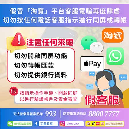 司警局反詐騙協調中心提醒全澳市民:淘寶及支付寶的「資金/支付安全保障」屬平台提供的免費服務且無需續期,倘接到自稱淘寶、支付寶或其他平台客服人員的電話聲稱涉及保費到期,必定為詐騙,應立刻掛線;不論接到自稱任何機構的客服來電,切勿按對方指示進行同屏操作、透露任何個人銀行訊息,更不可進行任何銀行交易操作;如對來電者身份存疑時,應透過有關機構的官方聯絡途徑自行致電求證;如有懷疑,應使用司警局「反詐程式」查核詐騙風險指數,又或致電司警局防詐騙查詢熱線88007777或報案熱線993求助。
