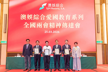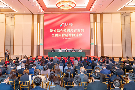 【特訊】澳娛綜合度假股份有限公司(「澳娛綜合」)植根澳門,心繫祖國,一直積極推動愛國教育,向員工及社會弘揚愛國愛澳精神。集團於3月25日上午假新葡京酒店宴會廳舉行「澳娛綜合愛國教育系列.全國兩會精神傳達會」,獲中央人民政府駐澳門特別行政區聯絡辦公室經濟部孫耀華處長出席支持,由澳娛綜合董事兼員工福諮會主席梁安琪擔任主持,並邀請了全國政協常委何潤生,澳區全國人大代表吳小麗、何敬麟,及澳區全國政協委員林倫偉擔任分享嘉賓,向現場逾四百位澳娛綜合團隊成員傳達今年全國兩會的重要內容和訊息。