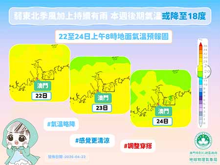 氣象局表示,春季最後一個節氣「穀雨」已過,近日雨水亦有增多,預料本週中期開始,華南地區天氣轉趨不穩定,氣象局預料一道低壓槽將逐漸發展為冷鋒,並於週四(今日)南下影響廣東沿岸,屆時本澳驟雨增多,雨勢有時頗大及有雷暴。此外,受高空擾動影響,週五(明日)至週六(二十五日)初時,持續有頻密驟雨及幾陣雷暴,單日累積降雨量可達五十毫米或以上。冷鋒過境後,本澳受弱東北季風影響,氣溫將有所下降,週五至週六(二十四至二十五日)最低氣溫可降至十八至十九度左右,由於伴隨頻密降雨,溫度體感將更為清涼,氣象局提醒市民適時調整穿搭。