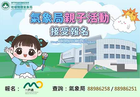 【特訊】為持續推動多元化的氣象科普教育工作,地球物理氣象局將於2025年7月繼續舉辦“氣象FUN識親子遊”及“遊氣象 樂探索”兩項親子活動。活動旨在帶領參加者開啓一趟探索氣象科學樂趣,感受氣象科學魅力的親子旅程,並藉有趣互動的氣象之旅,加深參加者對本澳氣象服務及運作的瞭解。兩項活動均以粵語進行,由即日(7月1日)起至7月6日期間,可透過一戶通的“活動報名”欄目報名,參加者於活動結束後可獲精美紀念品乙份。
