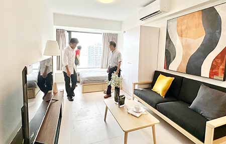 張先生、張太太正居住於「祐漢七棟樓群」之一的吉祥樓。昨天,張先生夫婦二人到暫住房的示範單位參觀,了解空間佈局及配套設施,租金方面他們希望政府有所補貼。張生張太表示,吉祥樓現在環境真的很惡劣,那邊的石屎掉落、樓梯全都很髒亂,環境衛生各方面。暫住房東南方向、西南方向都挺好的,這邊都挺好的,全部都不錯,就是差了曬衣服的位置,曬衣服的位置是有的不過小一點,如果過來租金一定不能收那麼多。