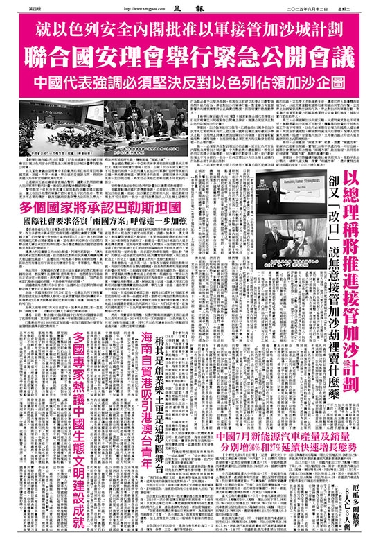 就以色列安全內閣批准以軍接管加沙城計劃 聯合國安理會舉行緊急公開會議 中國代表強調必須堅決反對以色列佔領加沙企圖