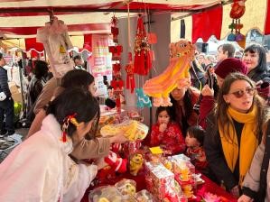 正月初五,卡姆登市集人聲鼎沸,紅燈高掛、春聯映目。廟會之上,戲曲唱腔婉轉悠揚,民樂旋律清越動人,傳統藝術在異國街頭綻放獨特光彩。非遺體驗區內,書法揮毫寫福、手工巧制佳物,吸引不同膚色、不同年齡的民眾踴躍參與。
