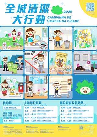 全城清潔大行動啟動儀式將於3月28日下午4時在祐漢街市公園舉行,市政署、經濟及科技發展局、旅遊局、衛生局、土地工務局、公共建設局、環境保護局等多個部門及社團代表共同參與。啟動儀式後將組成多個小隊前往附近社區,向居民、大廈管理員及住戶、商戶負責人等派發宣傳品,提升公眾環境衛生意識。同時,相關職能部門亦將走訪食肆、食品加工場及在建地盤等,推動場所負責人落實有效的衛生管理措施,維護社區整潔與衛生。