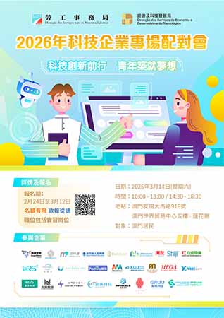 【特訊】為積極配合特區政府推動經濟適度多元發展策略,協助科技企業招聘人才並促進本澳青年就業,勞工事務局(下稱“勞工局”)與經濟及科技發展局(下稱“經科局”)將於3月14日合辦“2026年科技企業專場配對會”,為有意投身科技行業的本澳居民提供即場面試及就業對接機會,推動青年投身科創產業,培養本地多元化人才。