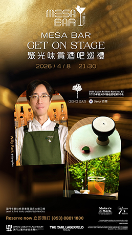 聚光味賞酒吧巡禮 日期: 2026年4月8日(星期三) 時間: 晚上9時30分至凌晨12時30分 地點: 澳門卡爾拉格斐奢華酒店大樓三樓 — 味賞酒吧 預約及查詢:+853 8881 1800。