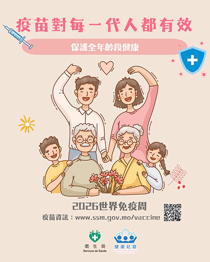 今年“世界免疫周”主題是“疫苗對每一代人都有效”,倡議各年齡層人群包括兒童、青少年、成年人等應透過免疫接種保護自己及其社區免受傳染病的威脅,從而降低患病風險及延長壽命;鼓勵各地政府提供更優質的防疫接種服務,縮小國際間免疫水平差距。而本澳防疫接種計劃免費人群覆蓋範圍廣泛且疫苗種類全面,共可預防13種傳染病,除了常規預防結核病、乙型肝炎、百日咳、破傷風、白喉、脊髓灰質炎、麻疹、德國麻疹(風疹)、流行性腮腺炎等疫苗外,先後加入預防水痘、子宮頸癌、流感嗜血桿菌(引起幼兒腦膜炎)感染、肺炎鏈球菌感染等疫苗,還增加兒童接種第2劑水痘疫苗,並為孕婦及小六學生接種含百日咳疫苗等。此外,提供接種流感疫苗及新冠疫苗,從而更大範圍保障居民健康。