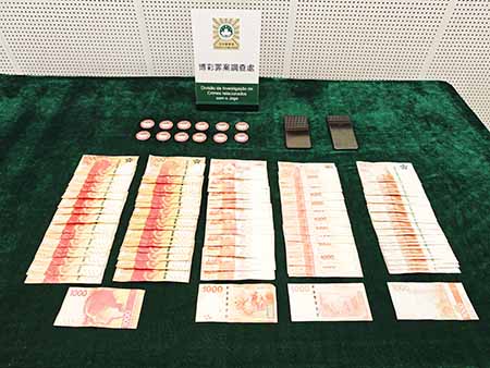 被捕的內地男子姓鄭,三十九歲,無業;涉及巨額詐騙被送交檢察院處理。案中的男事主為中年人,非本澳居民。案情指,本月二十六日晚上十時,涉案的鄭姓男子在路氹某賭場向事主搭訕,稱想將贏得的十二萬港元籌碼兌換成人民幣。事主起初因匯率問題,未有答應。約一小時後,事主在該賭場的吸煙室重遇鄭姓男子,同意先協助兌換十萬港元籌碼,但要求鄭姓男子需一同到賬房查核籌碼的真偽。鄭姓男子隨即拒絕並急步離開,事主感到可疑,尾隨鄭姓男子並通知賭場的保安,懷疑有人詐騙。司警接報到場處理,在鄭姓男子身上起出十二個面值一萬港元的假籌碼,以及八十六面值一千港元的假鈔,該批假鈔上分別寫有COPY或PROP字樣的道具鈔。司警稱,該批假碼大小與重量與真碼相若,但顏色及防偽貼紙與真碼有差別,同時假碼無晶片;而道具鈔製作粗糙及無水印。經調查,鄭姓男子從內攜帶有關假碼及假鈔來澳,專門扮客詐騙換錢黨。司警並扣押鄭姓男子身上的一部手機,正追查假碼及假鈔的來源,事主涉不法匯兌另案跟進。