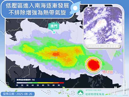【特訊】菲律賓以東再有低壓區醞釀發展,本澳氣象局稱,有關低壓區結構仍較為鬆散,預料未來一至兩天進入南海後逐漸發展,有機會發展成熱帶氣旋,氣象局稱,隨著高空反氣旋增強,本澳未來兩天陽光增多,市區天氣酷熱。