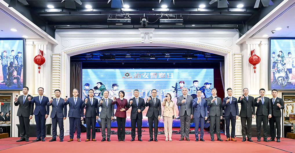 為慶祝每年三月十四日“治安警察日”,治安警察局昨晚七時半假萬豪軒酒家舉行慶祝晚宴。保安司司長陳子勁、中聯辦警務聯絡部部長王前進、解放軍駐澳門部隊參謀長邵春貴、檢察院檢察長唐曉峰、警察總局長梁文昌、海關關長何浩瀚等嘉賓出席。陳子勁帶領治安警察局高層向來賓祝酒,場面熱鬧。