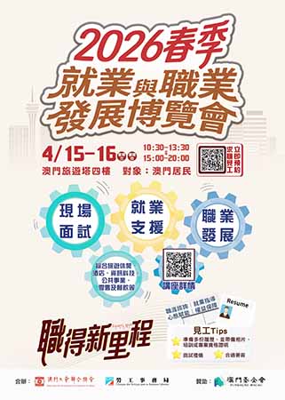 【特訊】勞工事務局與澳門工會聯合總會將於4月15日至16日一連兩日假澳門旅遊塔會展娛樂中心四樓,合辦“2026春季就業與職業發展博覽會”(下稱博覽會)。有意參加的澳門居民可由3月31日起至4月13日進行網上預約。