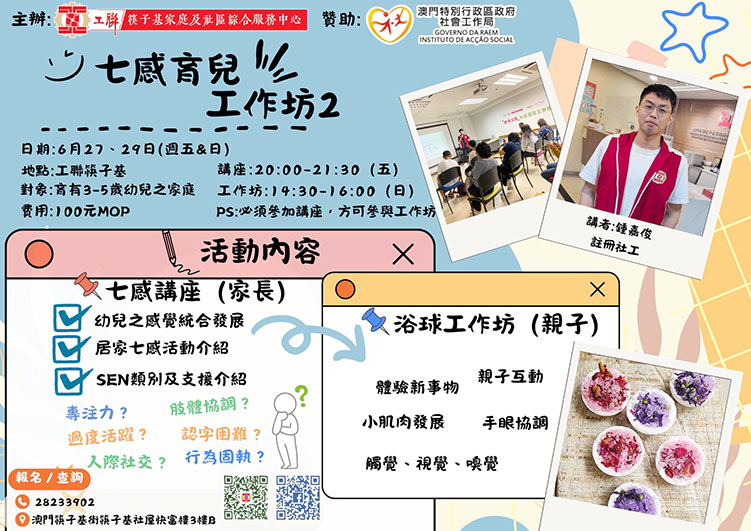 【特訊】為促進幼兒感官發展及增進親子互動,澳門工聯筷子基家庭及社區綜合服務中心將於6月27、29日舉辦「籽樂工房」七感育兒工作坊2。活動由澳門社會工作局贊助,分設專題講座與親子工作坊兩大環節,即日起接受報名。