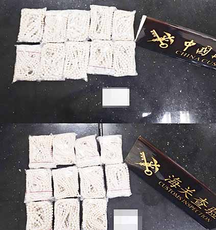 拱北海關稱,關員上月(七月)二十二日在港珠澳大橋珠海公路口岸進境車道巡查時,幾乎同一時間發現 兩輛粵港兩地牌私家車行駛軌跡異常,企圖逃避海關監管,截查後在 兩輛車上分別查獲十一包及十包黑色膠袋包裝的珍珠串。經核實,兩名司機是同夥,供稱幫人帶貨賺取「帶工費」。至於查獲的珍珠屬海水養殖珍珠,案件已移交後續處置。