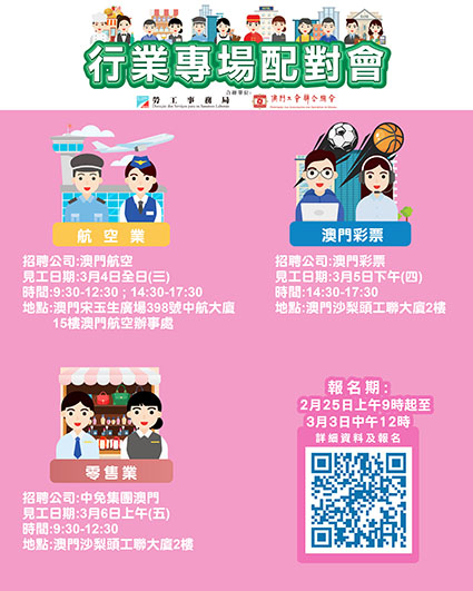 3月4日上午及下午的航空業專場配對會將於澳門宋玉生廣場398號中航大廈15樓澳門航空辦事處舉行;3月5日下午澳門彩票有限公司專場配對會及3月6日上午零售業專場配對會均在澳門沙梨頭海邊街2-6號工聯大廈二樓舉行。報名日期由即(25)日上午9時起至3月3日中午12時。