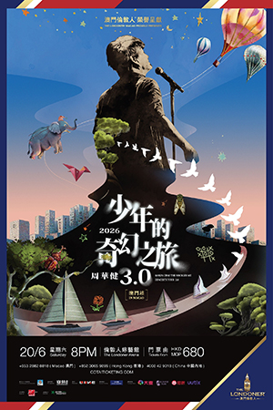 【特訊】華語樂壇歌王周華健將於2026年6月20日再度登陸澳門倫敦人® 的倫敦人綜藝館,帶來「少年的奇幻之旅3.0」巡迴演唱會澳門場。門票即將於2026年4月14日(星期二)中午12時起透過金光票務、澳門售票網、大麥網、貓眼及uutix同步發售。