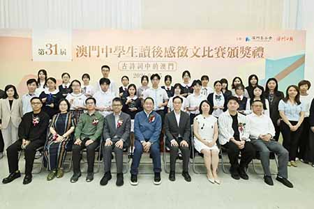 【特訊】由澳門基金會與澳門日報合辦的第三十一屆“澳門中學生讀後感徵文比賽”反應熱烈,本屆以“古詩詞中的澳門”為主題,共收到27間學校439份參賽作品。頒獎禮已於2026年4月25日在澳門教科文中心舉行,主辦單位向二十位獲獎學生頒發獎座,以示鼓勵。澳門基金會行政委員會主席吳志良,澳門日報總編輯崔志濤,高中組評判谷雨、陸奧雷,初中組評判譚健鍬、林格,以及各校校長、老師、獲奬同學及其家長出席典禮,場面熱鬧。