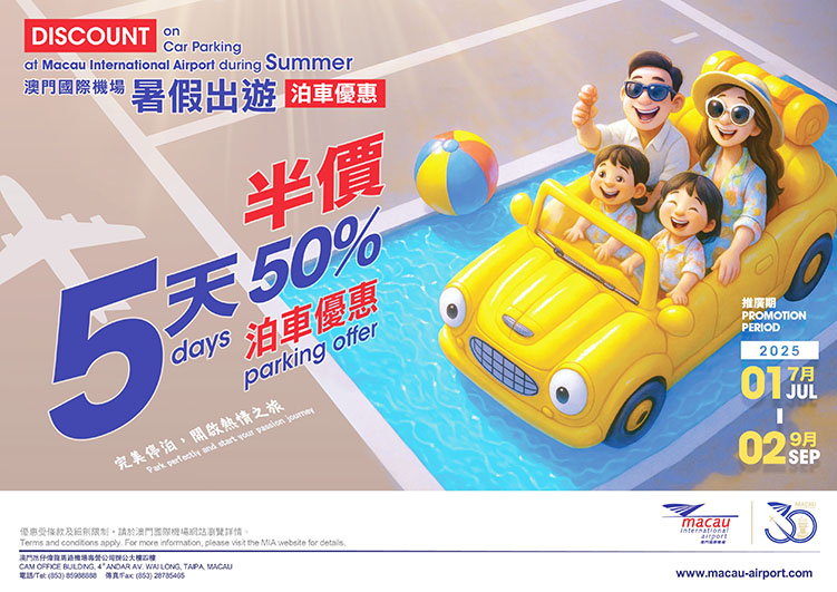 【特訊】為慶祝澳門國際機場營運三十周年並迎接2025年暑假旅遊旺季,澳門國際機場特別推出暑假泊車優惠。由2025年7月1日至9月2日,凡在澳門國際機場出遊的旅客可享最多連續5日半價泊車優惠,優惠適用於澳門國際機場南面及北面停車場。旅客無需預約登記,只需從澳門國際機場出發及回程飛抵澳門國際機場,並在取車前須親臨到達層繳費處出示本人之有效旅行證件及來回登機證,即可獲得相關泊車優惠,否則優惠無效。車位數量有限,優惠先到先得,旅客出門前可於澳門國際機場網站及微信官方帳號查詢停車場實時車位餘額數量,以便掌握行程。