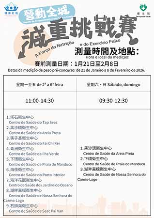 衛生局表示,已報名參賽的人士可在1月21日起至2月8日期間,帶同實體或電子澳門居民身份證前往衛生中心完成賽前測量,各衛生中心開放進行測量時間請參見附圖。在完成測量後,合資格參賽者將於2月10日收到短訊確認通知。各衛生中心已做好充分準備和相關工作人員均已完成培訓,務求為居民提供更便捷、更準確的測量服務,與居民攜手共建 “健康澳門”。