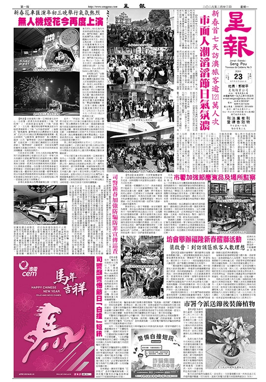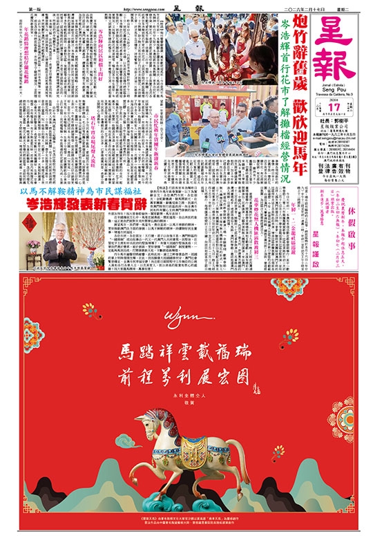 【特訊】炮竹聲響辭舊歲,萬家歡欣迎馬年。今日是丙午馬年正月大年初一,本報祝願各位讀者及全澳市民,馬到成功,龍馬精神。昨日年廿九除夕,本澳迎新年氣氛熱鬧,眾多市民忙著辦年貨、買年花,希望在新正頭取好意頭,市面上佈置了各式各樣生動可愛的馬年裝飾,供遊人「打卡」拍照,十分熱鬧。而行政長官岑浩輝到塔石年宵市場行花市,並到氹仔炮竹燃放區燒煙花,十分熱鬧。除夕晚上大批市民除了行花市及放煙花,亦到廟宇上香,祈求馬年生活穩定,祥和繁榮;市面上洋溢一片新春熱鬧氣氛。