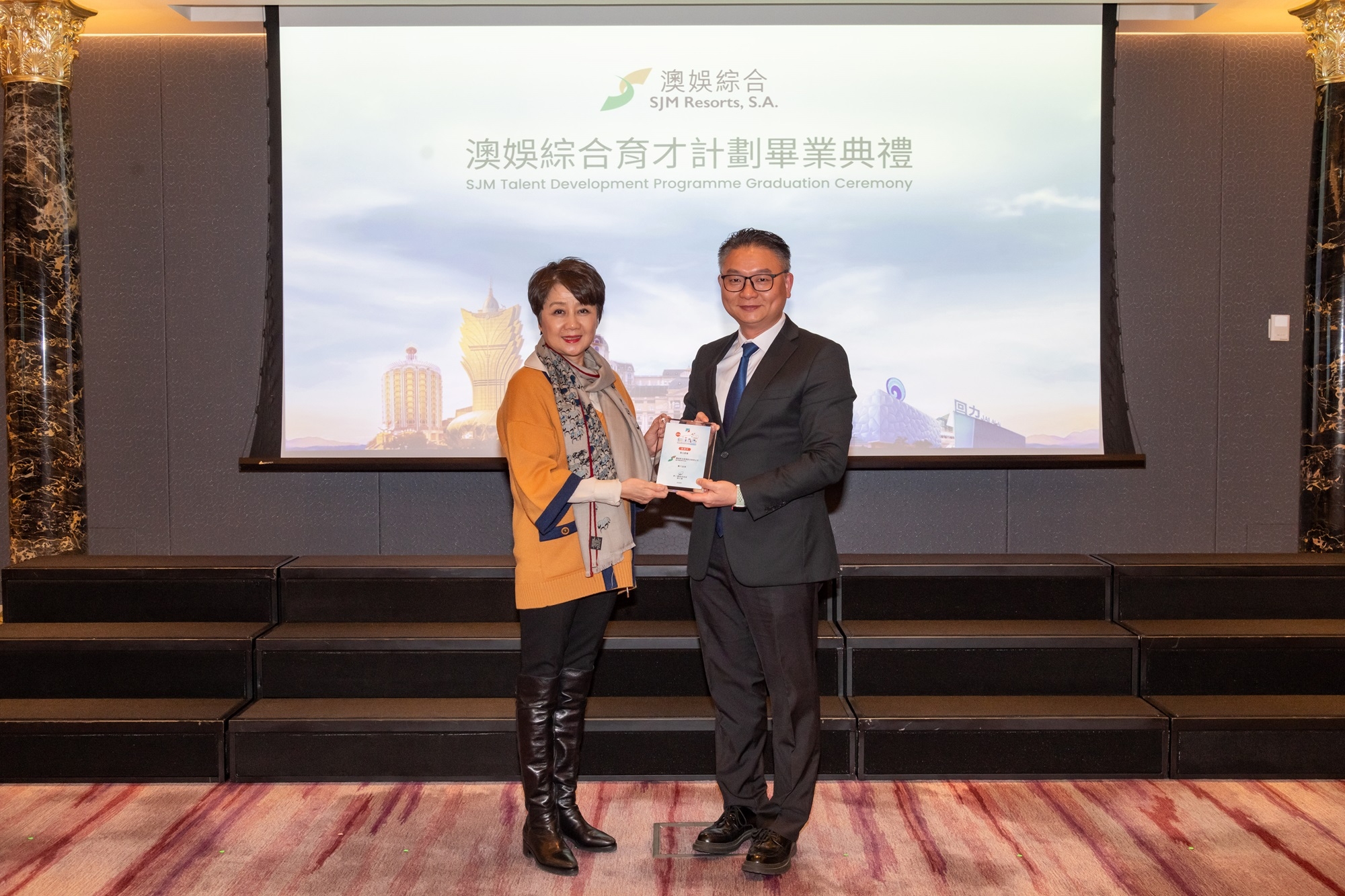 澳門特別行政區政府勞工事務局局長陳元童、副局長陳子慧、澳娛綜合董事兼員工福利諮詢委員會主席梁安琪、澳娛綜合首席企業事務總監沈銘義,以及一眾管理層及嘉賓出席典禮,並為學員頒發證書,共同見證學員在不同培訓與實習計劃中的成長與收穫。