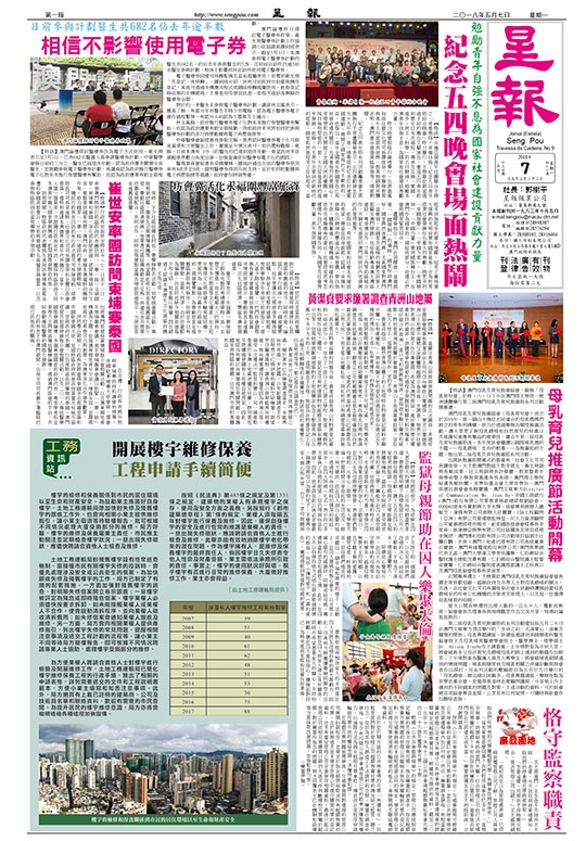 【特訊】由逾百個青年社團聯合主辦之「青春飛翔•承傳自強—紀念五四青年節綜合晚會」昨日舉行,主辦單位期望透過不同的舞台文藝演出,重温五四青年節的歷史由來及過程,傳承及弘揚「愛國、進步、民主、科學」的五四精神,勉勵本澳青年自強不息,為國家和社會建設貢獻力量。