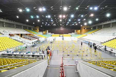 綜藝館接種站設有多個區域,接種人士到場先登記或取籌後量度血壓,沒有問題便可立即接種疫苗,若血壓不通過,則要進入醫生評估區域。綜藝館接種站只有一個出入口,位於羅理基博士大馬路近行車天橋落橋的位置。接種站協調醫生梁頌文表示,綜藝館接種站暫時每小時開放六十個預約名額,為鼓勵市民接種疫苗,會視乎當日的預約情況,開放即場登記接種名額,但暫時未可公布限額。