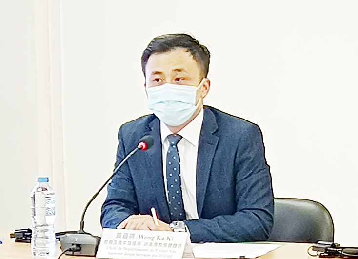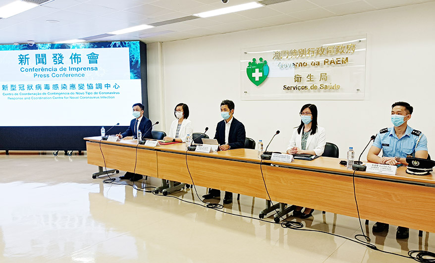 新型冠狀病毒感染應變協調中心昨日舉行記者會,仁伯爵綜合醫院醫務主任戴華浩、教育及青年發展局非高等教育廳廳長黃嘉祺、旅遊局傳播及對外關係廳廳長劉鳳池、治安警察局公共關係處處長李德輝、疾病預防控制中心傳染病防制暨疾病監測部協調員梁亦好共同會見傳媒。