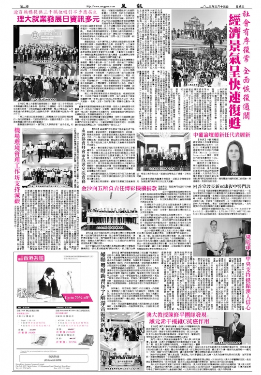 此外,結合特區政府旅遊局全方位啟動各客源市場的線上線下推廣,透過向內地、台灣地區及海外送出12萬張機票等多種措施全力拓展客源,在當前多重利好因素下,本澳經濟呈現持續快速復甦的勢頭。經綜合分析及推算,預料未來3至5月將繼續快速復甦至4.5-5.0分,有望在第二季內恢復至「穩定」等級。