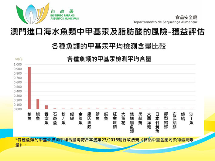 為了更好地瞭解本澳市面上常見進口海水魚,其脂肪酸的健康效應與甲基汞的健康危害,就食用價值進行評價及分析,是次研究採集了本澳市面20種最常見的進口海水魚類,合共143個樣本,主要檢測甲基汞及脂肪酸的含量。結果顯示,是次採集的20種海水魚類品種樣本的甲基汞含量各異,其中劍魚、鱈魚和吞拿魚等3種海水魚的甲基汞檢測含量較高;而沙丁魚、鯖魚、鰈魚、秋刀魚等12種魚類,具備較高健康效益且危害水平較低的特點,為優先推薦食用品種。總體而言,是次抽檢的所有樣本的平均甲基汞含量均符合本澳第23/2018號行政法規《食品中重金屬污染物最高限量》。