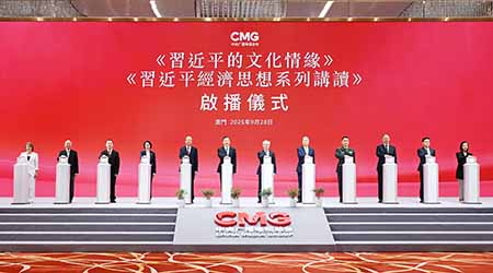 【特訊】《習近平的文化情緣》及《習近平經濟思想系列講讀》兩部專題片在澳門啟播。行政長官岑浩輝昨日(二十八)日在啟播儀式致辭時表示,期待以專題片啟播為契機,持續深化推動廣大澳門同胞和海內外人士對習近平新時代中國特色社會主義思想的關注、理解和實踐,共同講好中國故事、促進國際交流、不斷擴大“朋友圈”。