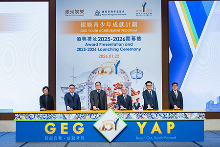 【特訊】多年來,銀河娛樂集團(下稱「銀娛」)積極響應澳門特別行政區政府(下稱「特區政府」)「教育興澳、人才建澳」的施政方針,透過多元舉措推動人才培育工作,促進本澳青少年全人發展。自2011 年起,銀娛攜手澳門管理專業協會(下稱「管協」)合辦「銀娛青少年成就計劃」(下稱「成就計劃」),秉承「自我認識」、「關懷社會」、「事業發展」三大核心理念,為18至29歲本地青年提供多元培訓及跨界交流平台,至今吸引超過3,600名學員參與。今日,銀娛假銀河國際會議中心舉行第14屆頒獎禮暨第15屆開幕禮,表彰學員過去一年的卓越成果,並為新一屆計劃揭開序幕。