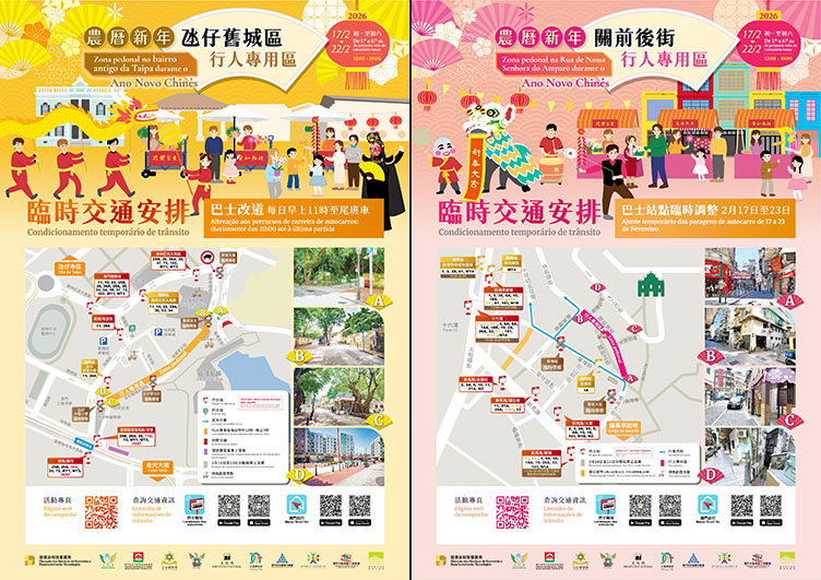 巴士服務方面,2月17日至22日每日早上11時至尾班車,氹仔舊城區四個巴士站需臨時停用,多條巴士路線需改道行駛,乘客可選用臨時站或周邊站點上落;而毗鄰關前後街區域的巴士路線維持正常運作,而因應節日期間新馬路的臨時巴士措施,2月17日至23日期間,途經草堆街的巴士路線全日實施臨時靠站安排。交通事務局已指示兩巴於客流高峰站點加強指示及增派人員協助分流乘客,並密切監測各站點候車情況,適時採取調度措施,確保公交有序服務。
