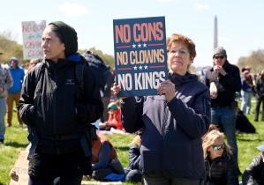洛杉磯約10萬民眾在市中心舉行抗議活動。抗議者揮舞著美國國旗,手持標語牌,批評特朗普政府當前執行的移民政策、經濟政策、對外政策以及非法擴展行政權力的行為。59歲的抗議者比利·布朗接受記者採訪時說:“曾經,這是一個讓我們所有人都引以為傲的國家。而如今,我們已淪為全世界的笑柄。”