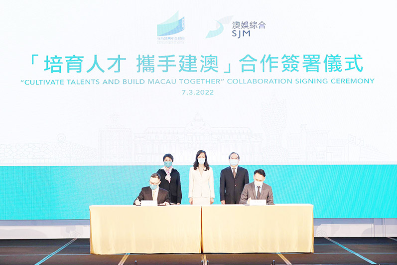 【特訊】為推動企業參與非高等教育職業技術教育事務,推動開展各類校企合作,教育及青年發展局(以下簡稱「教青局」)鼓勵有條件的學校與企業簽訂與職業技術教育課程相關的合作協議,同時鼓勵企業履行社會責任,協助推動親職教育工作。「培育人才,攜手建澳」合作簽署儀式日前假上葡京禮堂舉行 , 在社會文化司司長歐陽瑜、澳娛綜合度假股份有限公司(以下簡稱「澳娛綜合」)常務董事兼福諮會主席梁安琪、中央人民政府駐澳門特別行政區聯絡辦公室教育與青年工作部副部長茍人民的見證下,教青局局長龔志明和澳娛綜合首席企業事務總監沈銘義於2022年3月7日簽訂兩項合作意向,兩項合作協議包括「校企合作」及「親職教育培訓」。