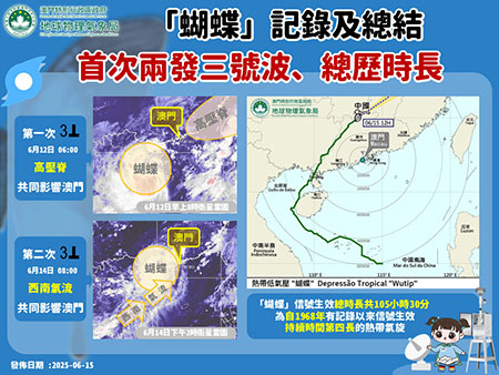 氣象局表示,熱帶氣旋信號(三號風球)的發出是基於本地風力變化的情況而定,回顧兩次三號風球生效期間,跨海大橋及空曠地區風力普遍持續達六至七級,其中:第一次三號風球 (六月十二日清晨六時生效) :受「蝴蝶」外圍環流與中國東南部一道高壓脊共同影響,六月十二日凌晨風力開始增強,由於預料風力將會持續一段時間,氣象局遂於六月十二日清晨發出三號風球,期間四條跨海大橋最大十分鐘平均風速介乎四十六至五十五公里/小時。而隨著高壓脊減弱,同時預料「蝴蝶」仍會持續影響本澳,氣象局同日下午改發一號風球。