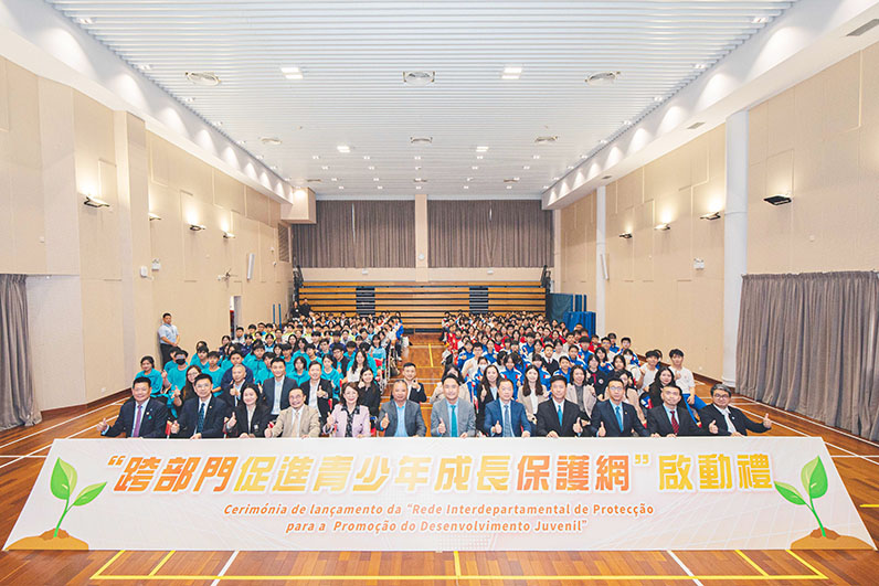 “跨部門促進青少年成長保護網”啟動禮於3月23日在高美士中葡中學舉行。教青局局長龔志明、副局長阮佩賢及黃嘉祺,澳門海關副關長李煜輝,法務局副局長邱顯哲,社會工作局副局長許華寶,警察總局局長辦公室顧問劉中志,衛生局仁伯爵綜合醫院代院長彭蓬光,治安警察局策劃行動廳廳長源劍鋒,司法警察局社區警務及公共關係處處長趙朱惠敏,消防局教育宣傳及公關處代處長黃思添,澳門中華教育會理事長鄭杰釗,澳門天主教學校聯會理事長劉麗妹,澳門高等教育發展促進會監事長仲偉合,以及治安警少年團、司警局滅罪小先鋒、海關守正之星、消防局救護小先鋒、法務局普法動力、教青局品德與公民推廣大使和學生代表共220人出席。