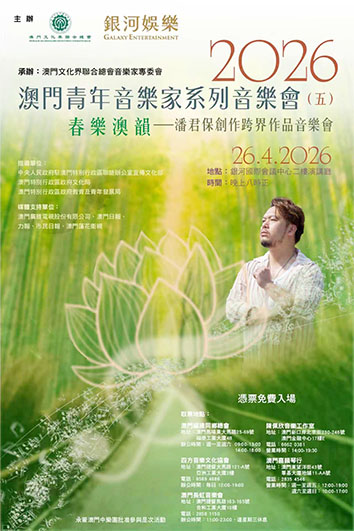 【特訊】由銀河娛樂集團(「銀娛」)與澳門文化界聯合總會聯合主辦、澳門文化界聯合總會音樂家專委會承辦之「澳門青年音樂家系列音樂會」2026年首場演出,將於4月26日在銀河國際會議中心之銀河演講廳隆重舉行。這場名為《春樂澳韻—潘君保創作跨界作品音樂會》的音樂盛宴,以「中西古今,澳門創作」為主題,由本土青年音樂家潘君保首次以主角身份擔綱亮相。音樂會融合中樂、西樂、流行與電子元素,是一次原創藝術音樂的精彩大集合。
