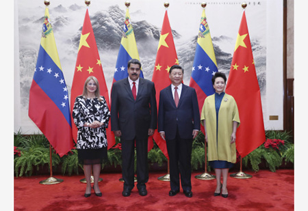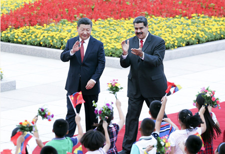 會談前,習近平在人民大會堂東門外廣場為馬杜羅舉行歡迎儀式。彭麗媛、楊潔篪、陳竺、王毅、何立峰、鄭建邦等參加。