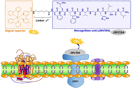 GRPr是一類蛙皮素G蛋白受體。過去人們一直認為GRPr主要在神經系統中發揮作用。近年來,研究發現GRPr表達紊亂不但與癌症發生有密切相關,而且和炎症因子釋放也有千絲萬縷的關係。研究團隊研製的探針不僅表現出理想的光物理性質,而且對細胞沒有明顯毒性。值得一提的是,由於該探針具有較長的磷光壽命,使其可通過時間分辨技術有效消除有機染料的熒光干擾,具有較好的生物樣品檢測應用潛力。通過實驗進一步說明該探針通過與GRPr特異性結合,可有效區分腫瘤細胞與正常細胞。同時該探針克服了傳統有機小分子熒光染料易光漂白的缺點,可實時監測腫瘤細胞中GRPr分佈。此外,該探針可通過抑制免疫細胞中GRPr活性,從而抑制炎症反應的發生。