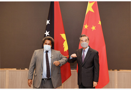 王毅表示,中國是你就任外長後首個出訪國家,你也是疫情發生後首位訪華的太平洋島國政要,充分體現了中國同巴新關係的特殊重要性。巴新是太平洋地區重要國家,是中方的好朋友、好兄弟、好夥伴。今年是兩國建交45周年。45年來,特別是習近平主席2018年對貴國成功進行國事訪問以來,雙方各領域合作加快發展,已成為大小國家和平共處、合作共贏的典範。