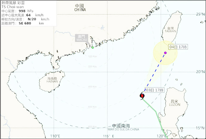 另外,進入南海的熱帶風暴「彩雲」於昨日下午五時距離本澳東南六百八十公里,本澳氣象局預料將繼續向偏北移動,且強度會減弱。