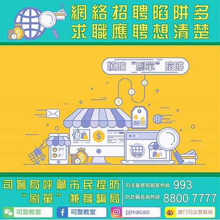 司警局表示“刷單”是新興的網絡詐騙手法。騙徒在社交平台刊登招聘廣告,招攬事主在指定網購平台購物,聲稱達到一定數量便可退回款項並賺取佣金,事主往往在加大購物金額後再無法取回任何款項。網絡招聘陷阱多,不法之徒往往以“工作輕鬆、無須經驗、薪金優厚”等作招徠,求職者稍一不慎便會墮入騙局。司警局呼籲市民在尋找兼職時須提高警惕,以免上當受騙。