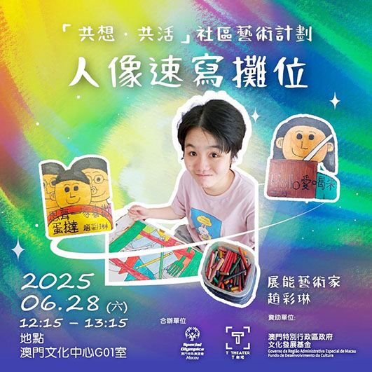 【特訊】T劇場與澳門特殊奧運會合辦的『共想 ‧ 共活』社區藝術計劃致力為智障人士提供表演藝術培訓,透過開發肢體及戲劇創作,增加他們參與藝術及展現藝術的機會,提升學員的自信心。兩團體將於6月舉行一系列活動,包括演出《明日似在遙遠》,將於2025年6月28日下午2時45分及下午5時,在澳門文化中心黑盒劇場I 進行兩場表演。同日更有三場展能藝術工作坊,分別由澳門展能藝術家謝健成,以及香港展能藝術家趙彩琳、張嘉媛帶領大眾創作,冀望持續建立一個平等的空間,讓學員及大眾共同對話及創作,減少社會對智障人士或身心障礙者的歧視與偏見。