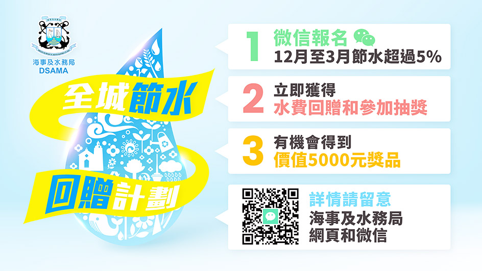 內地水利部門連續兩年評估今冬明春的水情較常年偏枯,珠江河口鹹潮上溯情況將較常年嚴重。為進一步增加居民主動節水的意識,今年海事及水務局對全民節水回贈計劃的參與流程作出調整,並加入抽獎環節。全澳的自來水用戶只要在澳門海事及水務局的微信公眾號,選擇“節水回贈計劃報名”一欄,在報名系統中輸入水費單編號(即合同號碼)、姓名和聯絡電話便可參加活動。