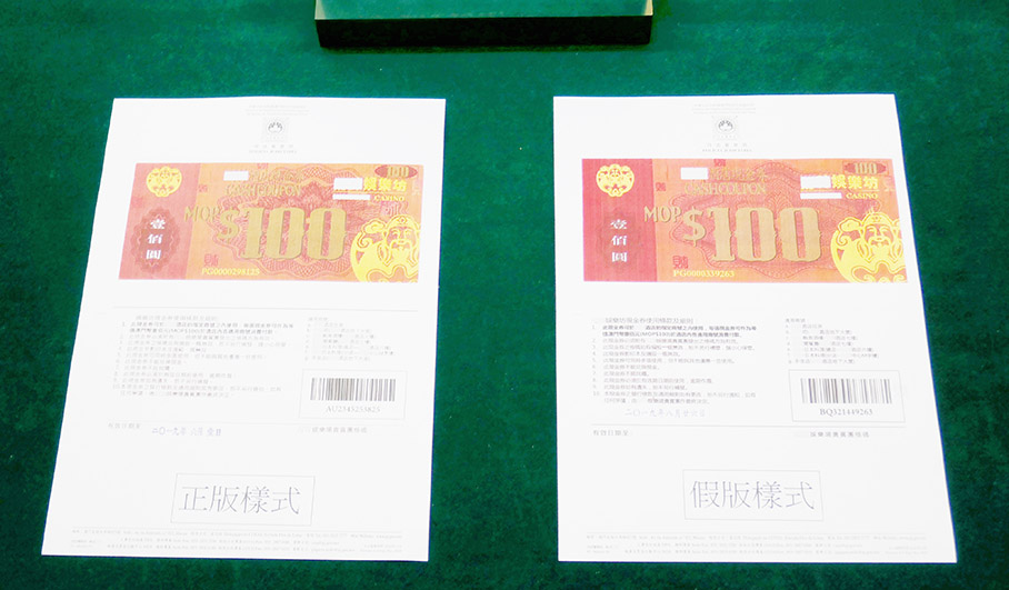 司警表示,於二零一九年四月二十六日,接獲某集團的一間金行及一間手信店舉報,指收購了一千七百四十二張,偽造新口岸某酒店的餐飲優惠券,面值每張一百港元,公司人員是以每張四十元收購所得,合共損失六萬九千六百八十元,經有關酒店核實該些券是偽造,其字樣及印章亦有差異。