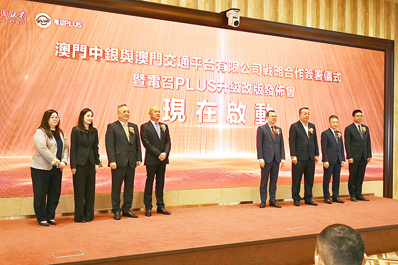 【特訊】為配合澳門特區政府著力落實「一中心、一平台、一基地」發展定位,務實推進「1+4」經濟適度多元發展策略。澳門中銀與澳門交通平台有限公司昨(十月三十一日)在中國銀行大廈三十三樓多功能宴會廳舉行戰略合作協議簽署儀式暨 「電召PLUS」APP升級改版發佈會,市政署市政管理委員會主席戴祖義、全國政協委員陳明金、經濟與科技促進營商處劉傑麟、行政會委員周永豪、立法會議員宋碧琪、梁孫旭、李良汪、中國銀行(澳門)股份有限公司總裁陳曉平、中國銀行澳門分行資深業務總監楊志光和許志瑜、中國銀行(澳門)股份有限公司副總裁林綺玲、澳門交通平台有限公司董事陳倩影以及本澳多家商會社團等代表出席。