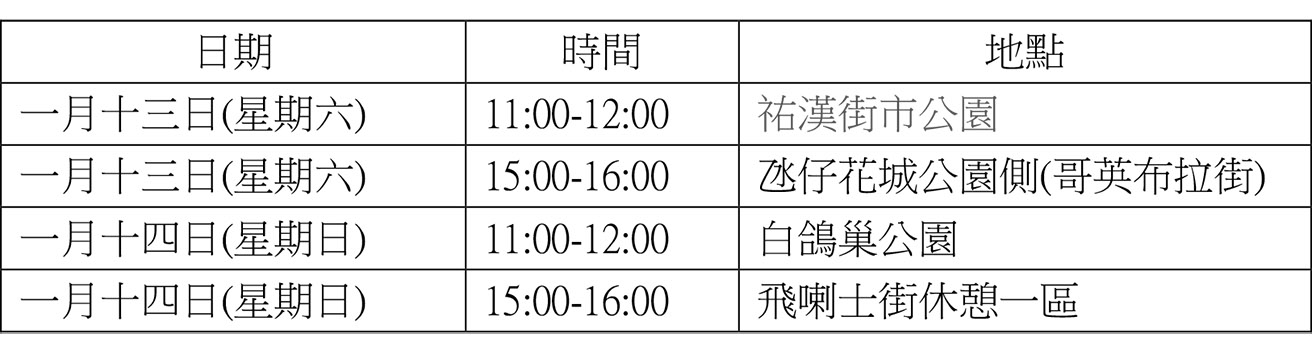 為美化城市及提升市民的生活質素,市政署每逢節慶及重要日子都會在大街小巷種植及擺放不同種類的應節花卉及植物。節日過後,部分綠化物資會作回收重植,而枯萎或不能種植的植物則按情況作堆肥場處理,回歸自然。另外,亦會按植物生長狀況贈予公眾。市政署將於本周下列時間及地點向市民免費派送節日回收的花卉: