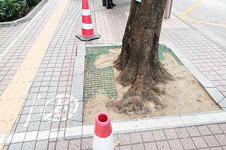 市政署樹木管護人員經多年觀察及養護實踐,逐步採用新型的高滲透、高強度的疏水透氣材質取代舊有的格柵,雨水可更易滲透並直接澆灌樹木根系;堅固平整的表面亦避免垃圾隱匿和絆腳風險,同時亦具保水、保護樹根、防止雜草叢生的作用。