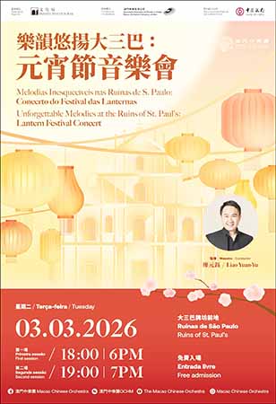 【特訊】由文化局主辦、澳門樂團有限公司承辦的“樂韻悠揚大三巴”元宵節音樂會,將於元宵節當天(3月3日)傍晚6時及7時在世遺景點大三巴牌坊上演兩場。澳門中樂團將演繹多首洋溢節日氣氛的的中樂名曲與流行作品,與觀眾歡度團圓良宵。音樂會免費入場,觀眾需遵從現場指示安排入座。